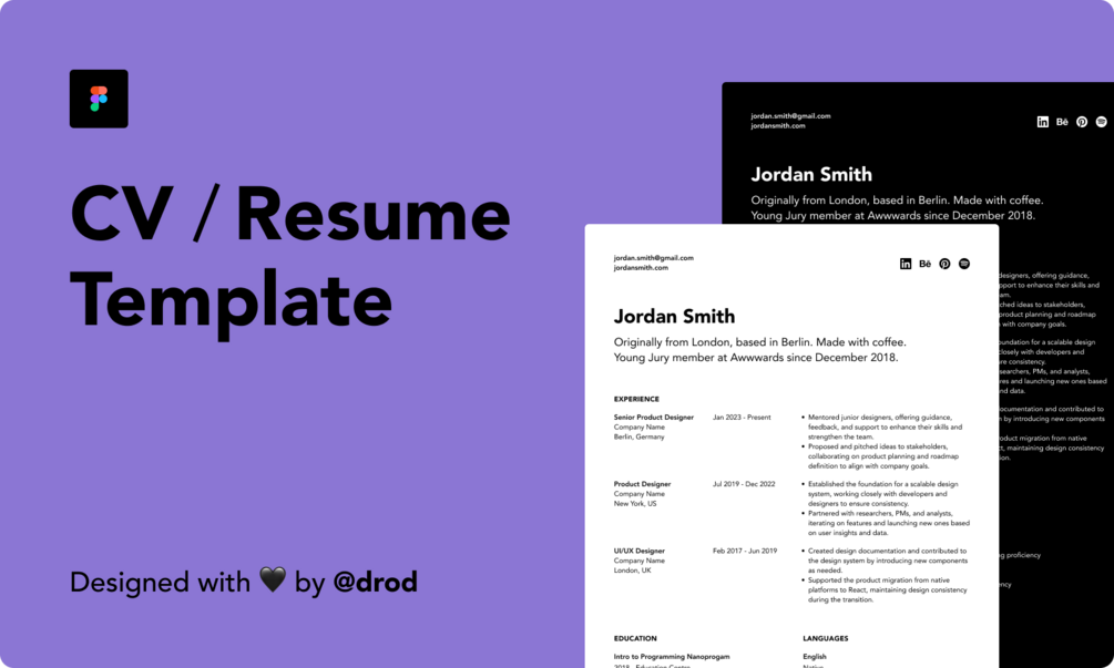 A clean, modern CV template built in Figma — perfect for UI/UX and Product Designers, but easily adaptable for any creative or tech role.